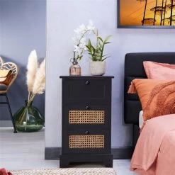 Nachttisch ROSHNI Mit 3 Schubladen Und Wiener Geflecht, Schwarz