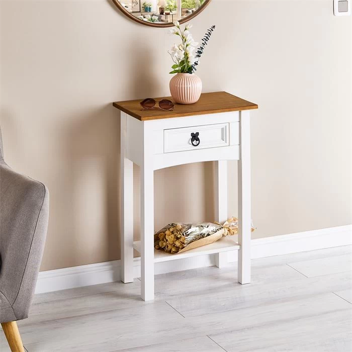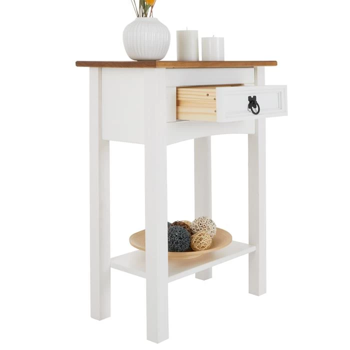 Schreibe die erste Rezension für „Konsolentisch CAMPO Kiefer Massiv Mit 1 Schublade, Weiß/braun“ Antwort abbrechen
